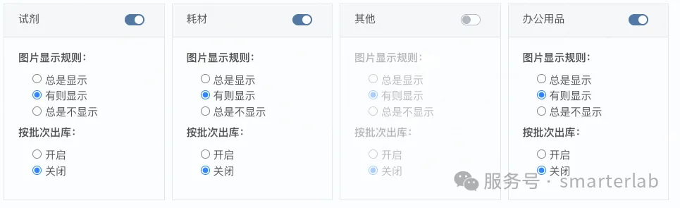• 支持按类别默认开启 / 关闭批次,适配不同耗材的管理需求;